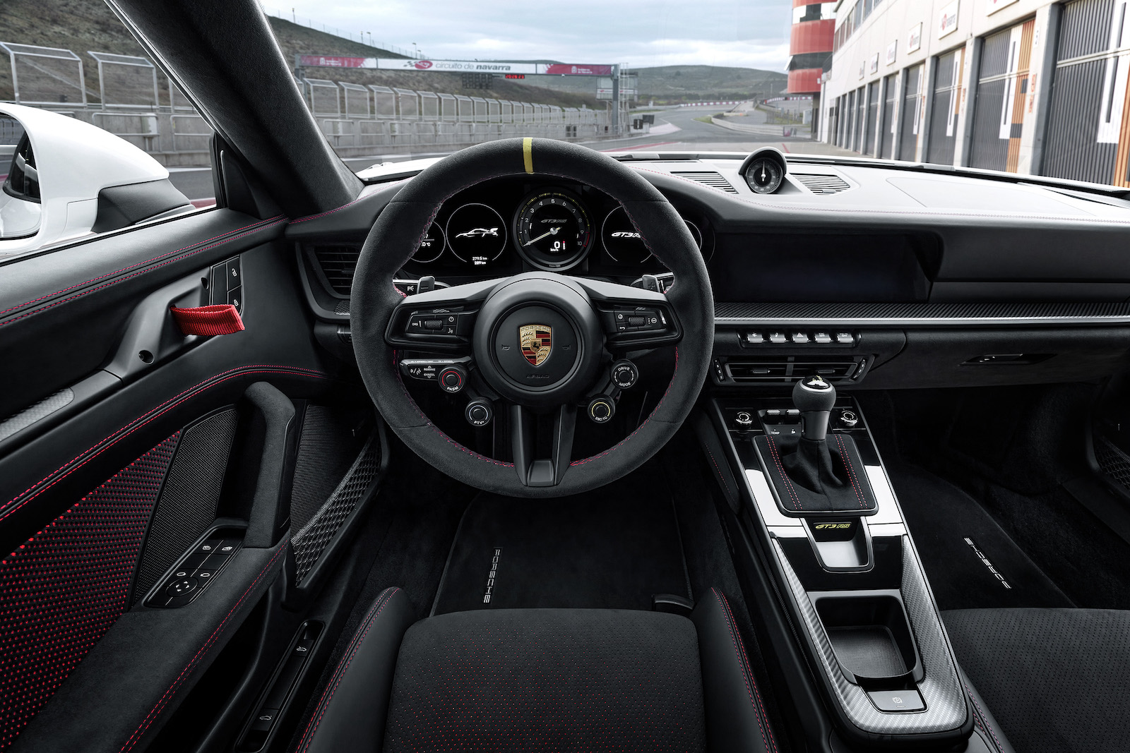 Im Innenraum präsentiert sich der neue GT-Sportwagen im typischen RS-Stil: Schwarzes Leder, Racetex und Sichtcarbon prägen das puristisch-sportliche Ambiente. Aufpreisfrei ist der 911 GT3 RS mit Clubsport-Paket erhältlich. Dieses beinhaltet unter anderem einen Überrollbügel aus Stahl, einen Handfeuerlöscher sowie einen Sechs-Punkt-Gurt für die Fahrerseite.