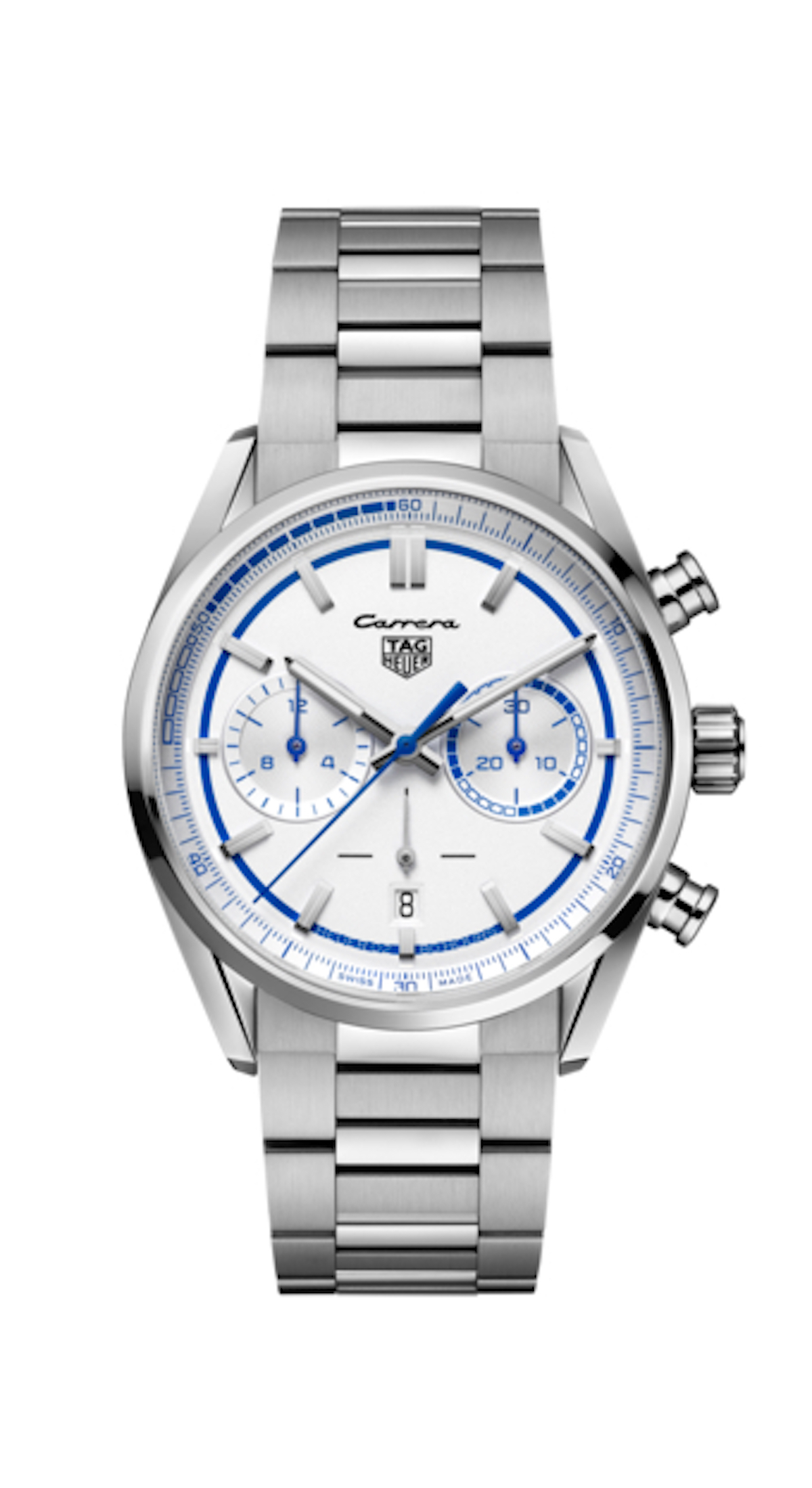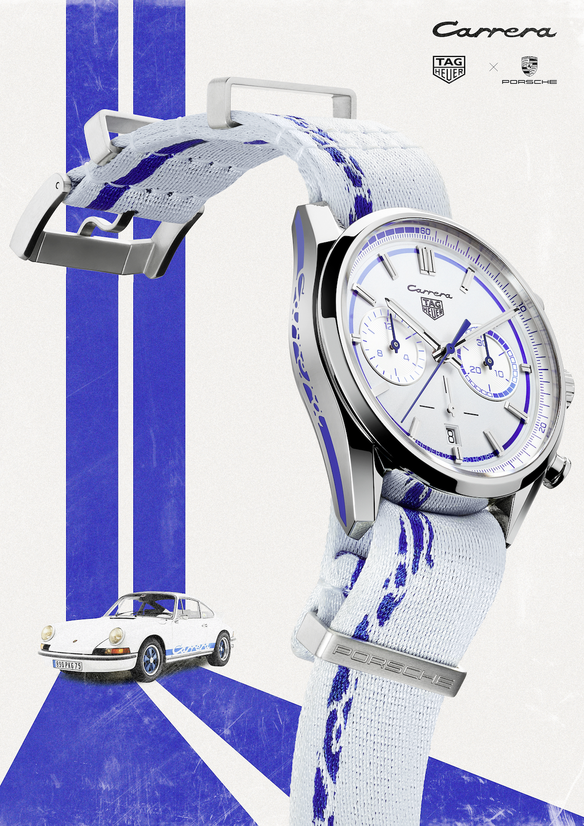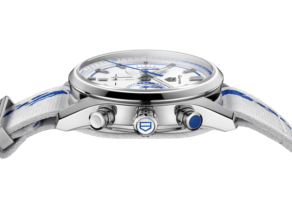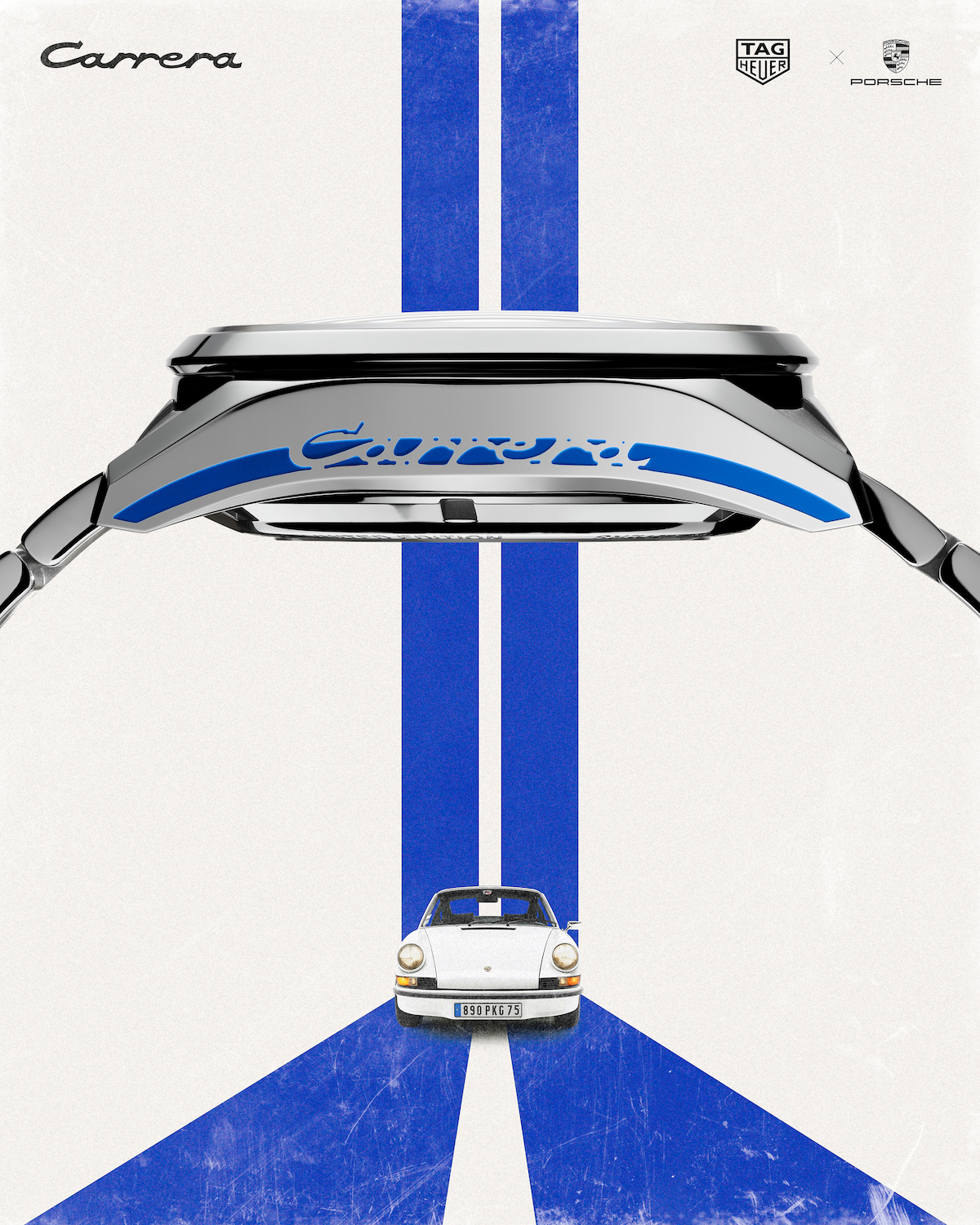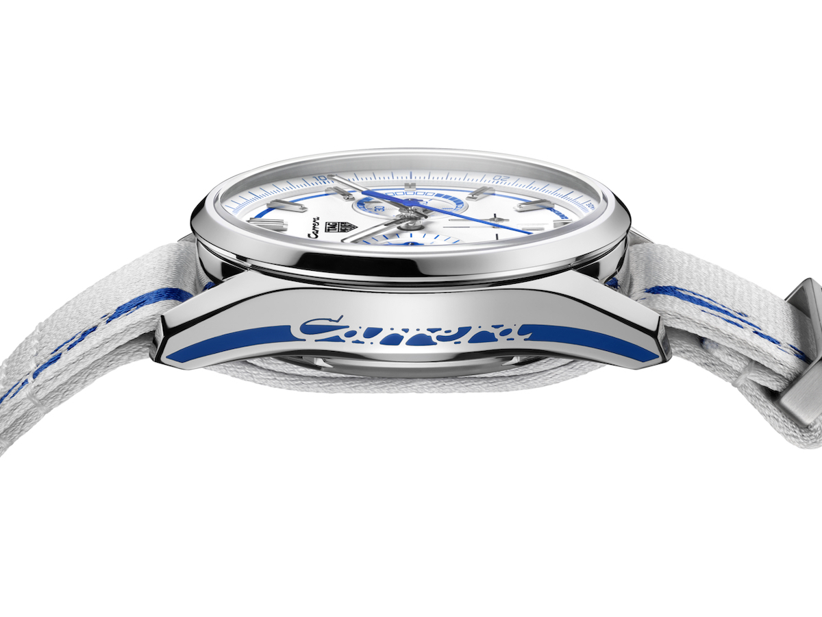 Die blaue Edition ist auf 500 Stück limitiert und mit der Seriennummer XXX/500 gekennzeichnet. Das fein polierte Stahlgehäuse, die rhodinierten Indizes sowie Stunden- und Minutenzeiger erinnern an die verchromten Türgriffe, Spiegel und Fensterrahmen des Wagens. Das Zifferblatt besteht aus glattem weissem Opalglas, während die zwei kleinen Zähler eine auffallende, azurierte Oberfläche aufweisen. Die Designsprache von Porsche ist im gesamten TAG Heuer Zeitmesser nahtlos integriert: mit seinen blau lackierten Chronographen- und zentralen Zeigern, seinen blau lackierten Druckknöpfen, seinem schildförmigen Logo auf der Krone und seinen blauen Markierungen an der Schwungmasse des Calibre Heuer 02 Manufakturwerks. Das Design des rechten kleinen Zählers ist in Felgenoptik gehalten, während der charakteristische Farbstreifen und das berühmte Carrera-Logo auf dem Zifferblatt, am Innenring, an der Gehäuseseite und am Armband der Uhr für kühne Eleganz sorgen.