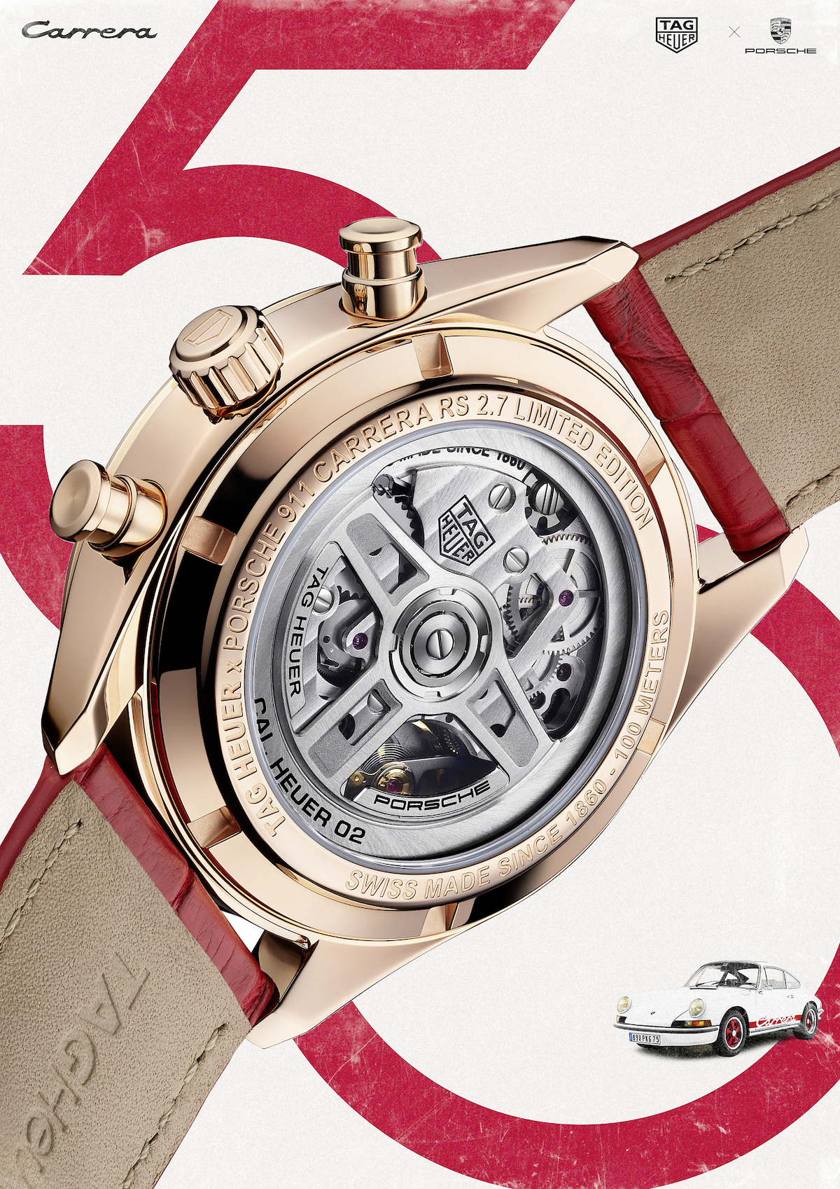 Mit diesen beiden Zeitmessern zum 50-jährigen Jubiläum des RS 2.7 demonstrieren TAG Heuer und Porsche zum wiederholten Male die Stärke und Authentizität ihrer Partnerschaft. Indem die beiden Marken zwei ihrer berühmtesten Designprodukte aus den Bereichen Rennsport und Uhrmacherkunst – die TAG Heuer Carrera und den Porsche 911 Carrera RS 2.7 – miteinander kombinierten, haben sie den ultimativen Ausdruck ihres gemeinsamen Carrera Renngeistes geschaffen. Diese beiden kühnen Zeitmesser vereinen eindrucksvoll die beliebtesten und bekanntesten Elemente beider Marken in sich. Sie werden Sammler und Fans der ganz speziellen Kombination aus Leistungsfähigkeit und Eleganz entzücken, welche TAG Heuer und Porsche auszeichnet.