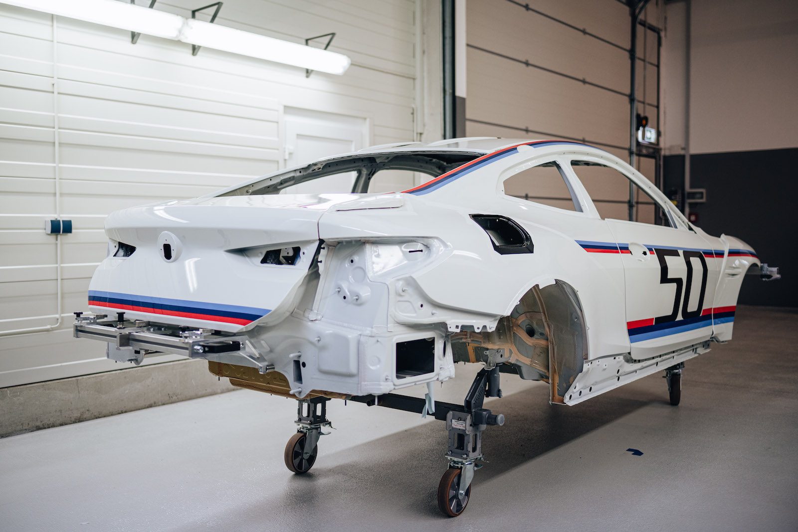 In der Lackiererei durchläuft die Karosserie zunächst den regulären Großserienprozess, bevor Dingolfinger Lackierspezialisten an speziellen Arbeitsplätzen die einzigartige Livery des BMW 3.0 CSL manuell mit Hilfe von Schablonen aufbringen. Gleichzeitig werden die Sonderanbauteile wie vordere Seitenwände, Stoßfänger, Motorhaube und Carbondach im Kunststoff-Exterieur-Bereich des benachbarten BMW Group Komponentenwerk Landshut in einer individuellen Lackierung versehen.