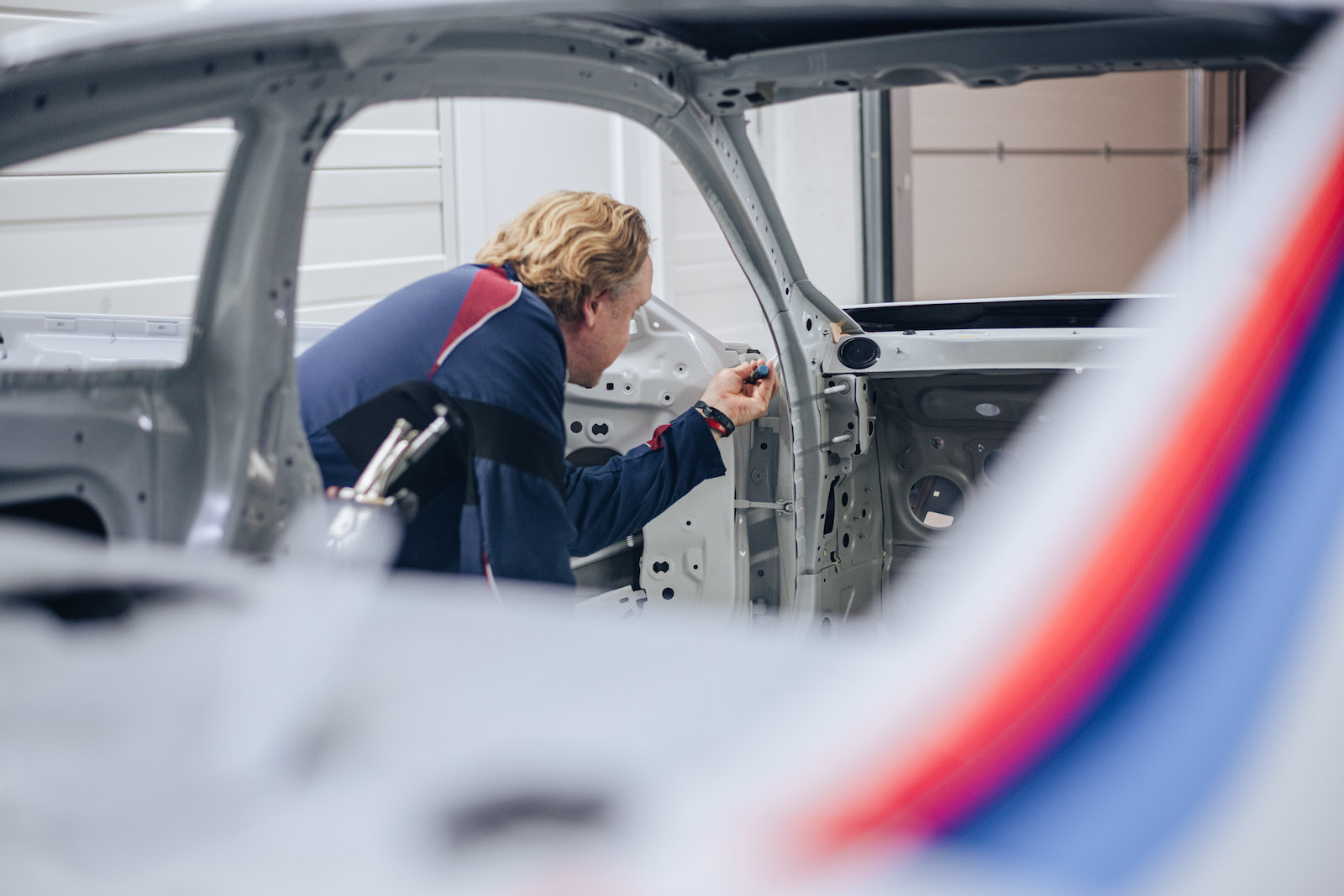 Das BMW-Werk wird deshalb vorübergehend zur Manufaktur. Denn um das exklusive Sondermodell produzieren zu können, müssen die Mitarbeitenden aus der Produktion Hand anlegen. Die Karosserie des BMW 3.0 CSL baut zwar auf einer Serienkarosserie des BMW M4 CSL auf, wird jedoch bereits in einem speziellen Arbeitsbereich des Dingolfinger Karosseriebaus umgebaut und angepasst. So werden in diesem Bereich, in dem auch die Rennsport-Karosserie des BMW M4 GT4 entsteht, beispielsweise die markanten Radkästen mittels spezieller Bördel- und Schweißprozesse verbreitert und für den Montageprozess vorbereitet.