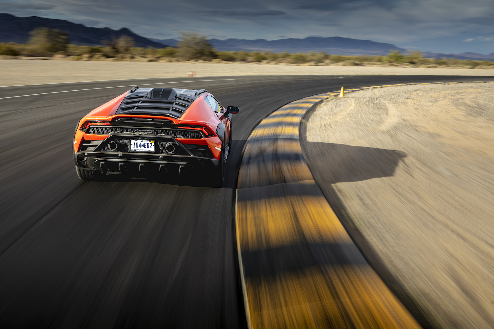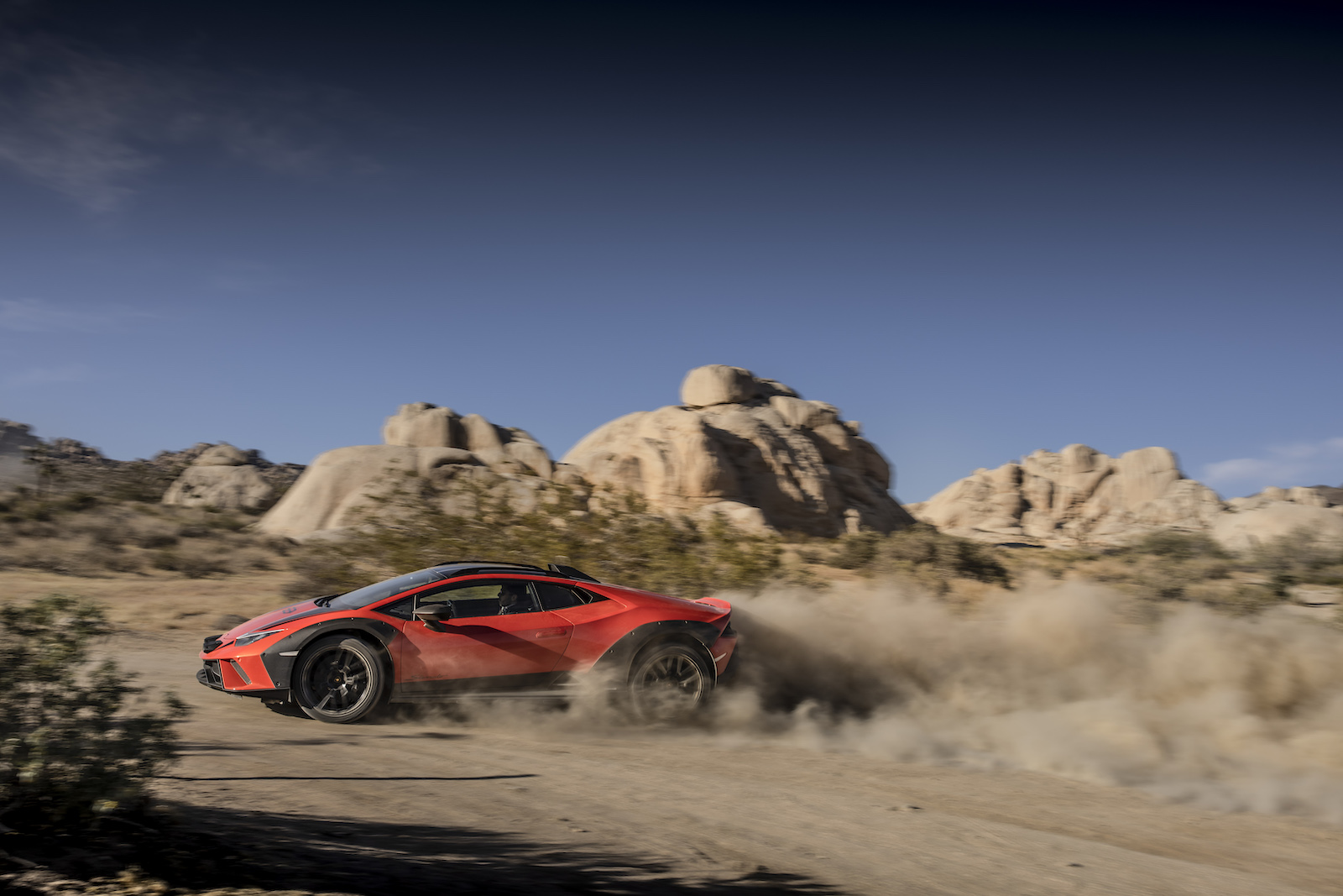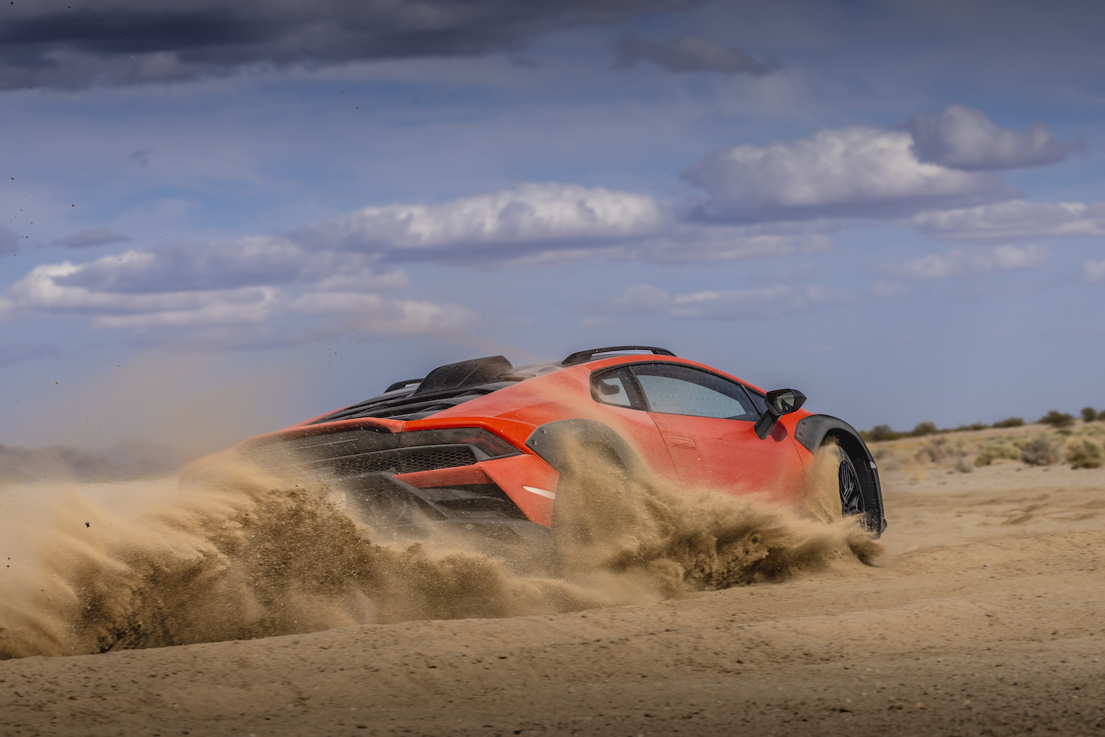 Auf den ersten Blick wird der abenteuerliche Charakter des Sterrato deutlich erkennbar. Im Vergleich zum Huracán Evo wurde die Bodenfreiheit um 44 mm erhöht, um einen größeren Federweg zu ermöglichen. Die Spurbreite vorne (+30 mm) und hinten (+34 mm) wurde vergrößert. Zusätzlichen Schutz bieten der vordere Unterbodenschutz aus Aluminium, die verstärkten Schweller, der Heckdiffusor und die robusten Radkästen. Diese Designmerkmale schützen nicht nur die Karosserie, sondern betonen auch das muskulöse Erscheinungsbild des Fahrzeugs. Ein prägnanter Lufteinlass auf der Heckklappe sorgt einerseits für einen sportlichen Look und versorgt andererseits den Motor mit sauberer Luft auf staubigen Straßen.