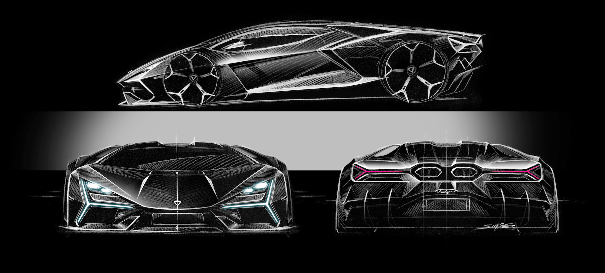 Der neue Supersportwagen lehnt sich an den unnachahmlichen Diablo mit einem auf den Kotflügeln befestigten schwebenden Heckflügel an und die kraftstrotzende und geneigte Front hebt eine Reminissenz an den Murcielago besonders hervor.