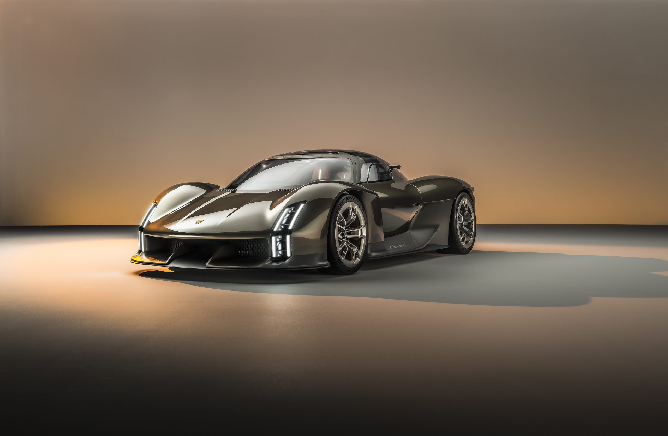 Besondere Aufmerksamkeit ziehen auch das Heck des Mission X und das modernisierte Porsche Wappen auf sich. Die Heckleuchten sind in einer freischwebenden Struktur gestaltet und erstrecken sich über die gesamte Breite des Fahrzeugs. Ein transparenter, leuchtender Porsche-Schriftzug und die pulsierende „E“-Markierung während des Ladevorgangs verleihen dem Heck eine besondere Note. Das modernisierte Porsche Wappen ist mit gebürstetem Edelmetall, einer dreidimensionalen Wabenstruktur und dezentem Goldakzent gestaltet und vermittelt ein zeitgemäßes Erscheinungsbild.