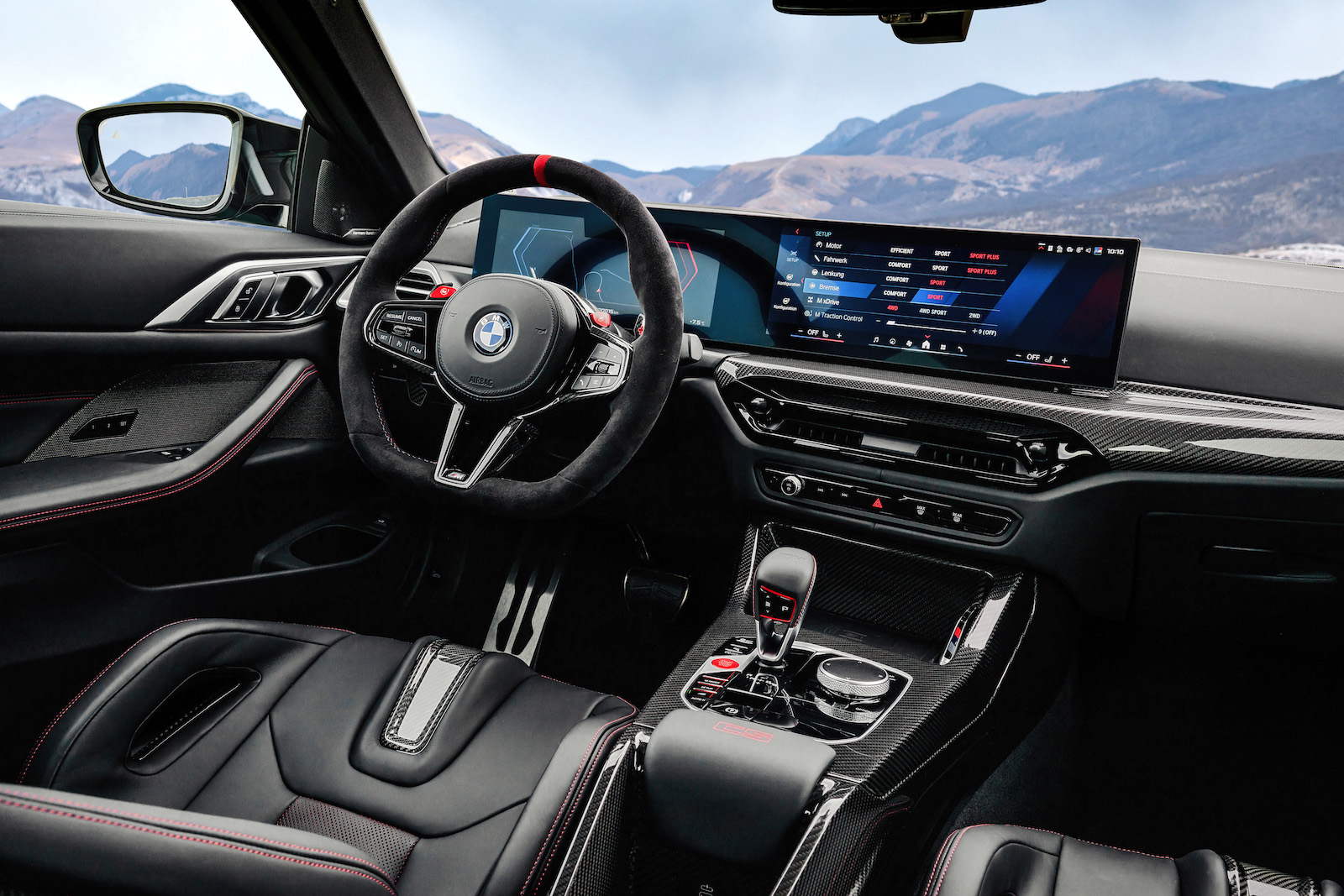 Im Innenraum des BMW M4 CS dominieren M Carbon Schalensitze, die sportlichen Halt mit hohem Komfort verbinden. Das serienmäßige M Alcantara Lenkrad, die Schaltwippen aus CFK und das exklusive Bicolor-Design der Sitze verleihen dem Cockpit ein unverkennbares Rennsport-Flair. Das M Drive Professional System bietet rennstreckenoptimierte Funktionen wie den M Drift Analyser und den M Laptimer, um das Fahrerlebnis weiter zu intensivieren.