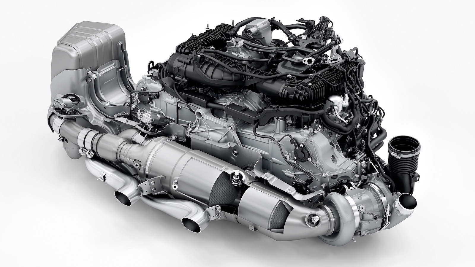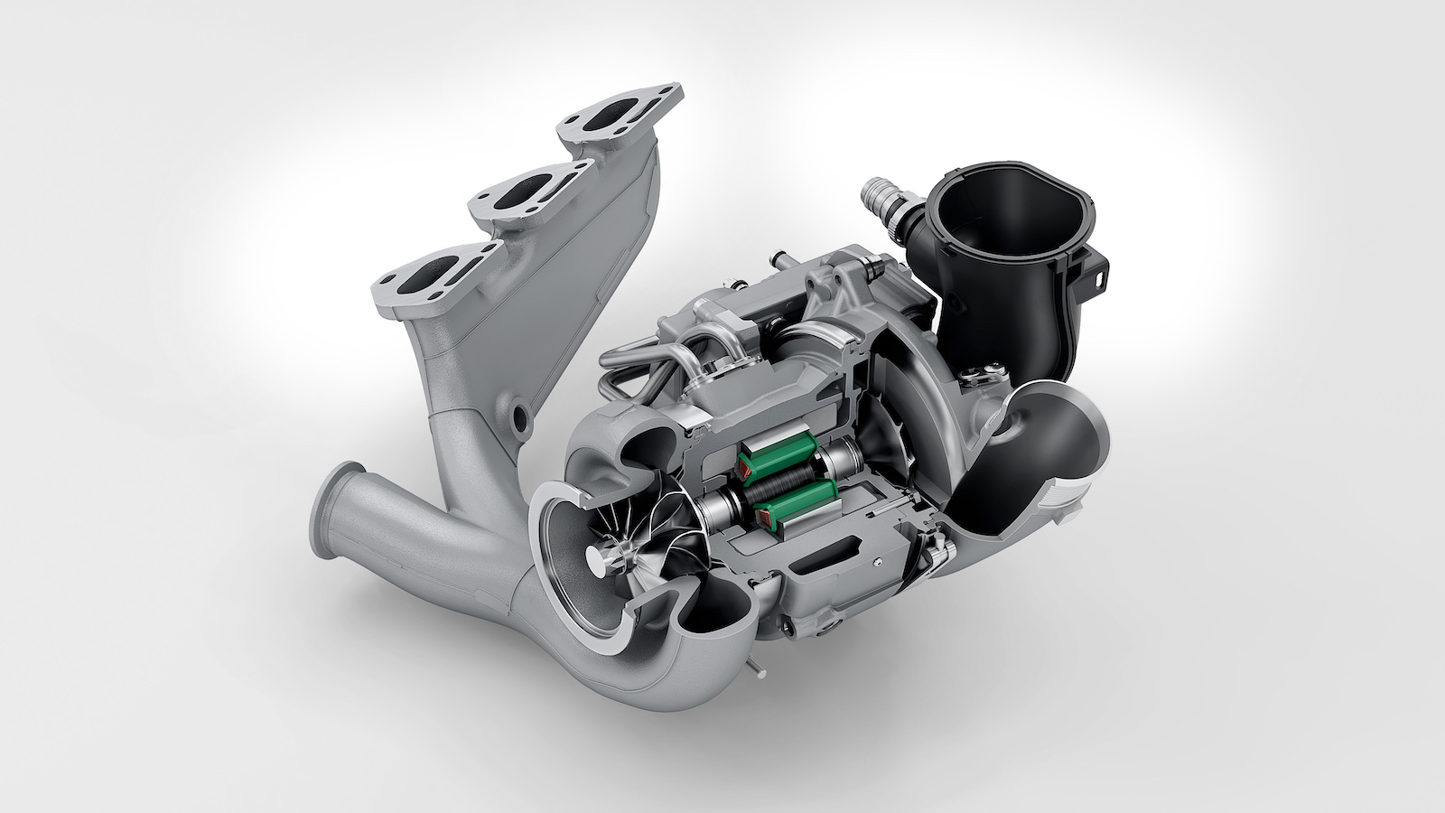 Das leistungsstarke T-Hybrid-System verfügt über einen neu entwickelten elektrischen Abgasturbolader. Eine integrierte E-Maschine, platziert zwischen Verdichter- und Turbinenrad, bringt den Lader blitzschnell auf Drehzahl. So wird unmittelbar Ladedruck aufgebaut. Die E-Maschine im Abgasturbolader arbeitet gleichzeitig als Generator. Sie erzeugt dabei bis zu 11 kW (15 PS) elektrische Leistung. Diese Energie wird dem Abgasstrom entzogen. Der elektrische Turbolader ohne Wastegate ermöglicht den Einsatz von nur einem statt wie bisher zwei Turboladern – bei gleichzeitig verbessertem Ansprechverhalten und gesteigerter Dynamik.